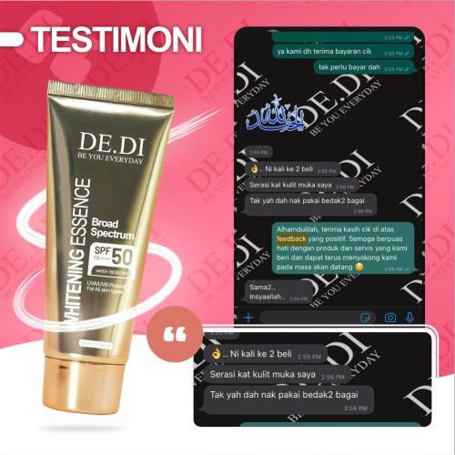 Kami sangat yakin Produk DE.DI WHITENING ESSENCE mampu menolong untuk merealisasikan impian anda untuk menyelesaikan masalah kulit wajah untuk menjadi semakin cantik dan kembali nampak muda 10 tahun.. Sudah tiba masanya untuk anda katakan YA untuk jadi cantik dan membuatkan pasangan anda bertambah sayang..